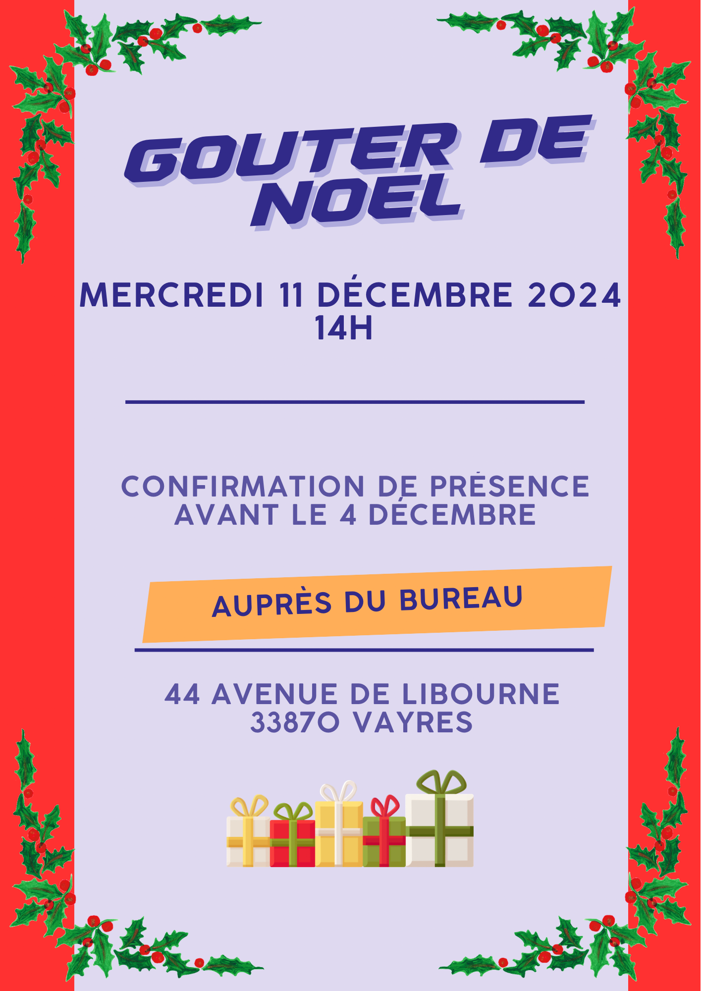 Nous sommes ravis de vous inviter à notre Goûter de Noël qui se tiendra le :
